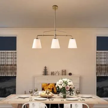 classy leaves Gold Chandeliers, Gold Linear Chandelier Light Fixture with White Fabric Shade, Modern 3 Light Island Light for Kitchen Dining Room Living Room
