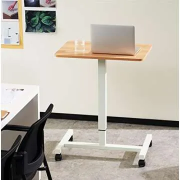 CLATINA Mobile Laptop Desk Pneumatic Sit to Stand Table Height Adjustable Rolling Cart with Lockable Wheels for Home Office Computer Workstation 28" x 19" Beige Round Edge Design Elegant