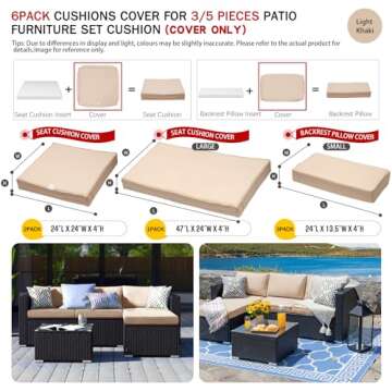 ClawsCover 6Pack Outdoor Seat and Back Cushions Replacement Covers Fit for 3 Pieces 3-Seater Wicker Rattan Patio Furniture Conversation Set Sectional Couch Chair,Light Khaki-Include Cover Only