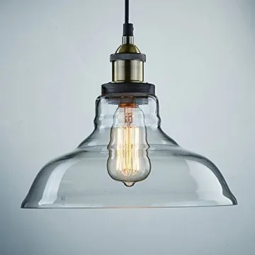 Show moreIlluminate your space with the CLAXY Ecopower Industrial Edison Vintage Style 1-Light Pendant Glass Hanging Light. This stunning piece combines industrial and retro aesthetics with a clear handblown glass dome shade and an antique bronze finish, making it a perfect accent for any modern or vintage-themed room. Whether it's for your kitchen island, coffee shop, bar, dining room, or office, this pendant light adds instant style and sophistication.