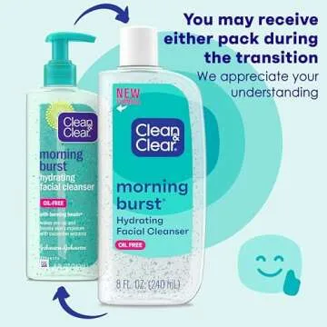 Show more Discover the ultimate morning rejuvenation with the Clean & Clear Morning Burst Oil-Free Hydrating Facial Cleanser, a refreshing solution designed to transform your skincare routine. This invigorating facial cleanser comes in a generous 8-fluid ounce bottle, perfect for daily use, and is enriched with BHA, cucumber, and aloe extract. It effectively cleanses your skin while removing excess oil and impure substances that can clog pores, ensuring a clean and revitalized complexion.