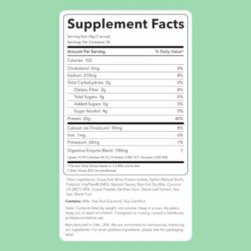Show more Introducing the ultimate indulgence for both your taste buds and fitness goals: our Mint Chocolate Cookie flavored protein powder. Imagine a product that not only satisfies your cravings for a delectable treat but also fuels your body with the nutrients it needs. This protein powder is crafted with the highest standards in mind, featuring 20 grams of grass-fed whey protein without any artificial colors, sweeteners, or added sugars. If you're someone who seeks a creamy, satisfying, and gluten-free option to support your active lifestyle, look no further!