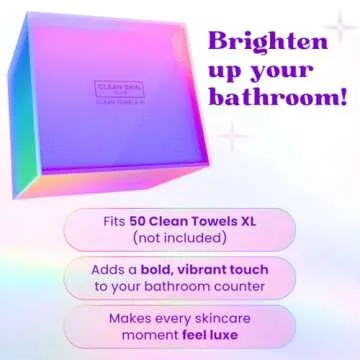 Show more Transform your bathroom into a vibrant sanctuary with the stunning Prism Box for Clean Towels XL! Designed specifically to fit up to 50 Clean Towels XL, this box will keep your towels clean, organized, and always within reach. The stylish and colorful design not only serves a practical purpose but also adds a fun and lively touch to your decor. Measuring at just 6.7 in (W) x 5.7 in (D) x 5.4 in (H), it is compact enough to fit comfortably on countertops, shelves, or even under the sink.