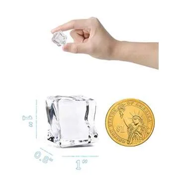 Show more Bring your decor to life with the Clear Fake Ice Cubes by DomeStar, a perfect solution for enhancing any display. This set includes 50 beautifully crafted ice cubes, measuring between 0.8 - 1 inch, designed to add a touch of realism and shine to your presentations. Unlike traditional ice, these acrylic cubes will never melt, ensuring that your displays remain stunning and mess-free. The slight irregularities in their shape mimic the look of real ice, capturing the light in a captivating way and making them an ideal choice for various occasions.
