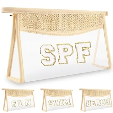 Clear Makeup Letter Patch Makeup Bag SPF Pouch, Boho Clear Toiletry Bag Travel Preppy Small Cute Stadium Letter Cosmetic Zipper Pouch Purse, Transparent Waterproof Beige Beach Makeup Pouch Clutch(SPF)