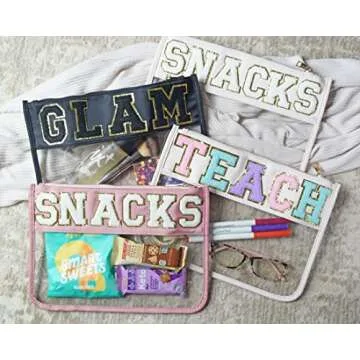 Clear Pouch with Patches, Varsity Letter Patches, Personalized Gift, Clear Bag, Makeup Bag, Snack Bag Pouch for Travel (Teach (ivory))
