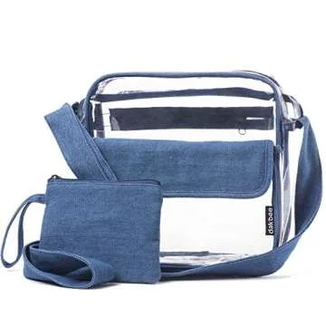 Clear Stadium Bag with Denim Trim | NFL NCAA PGA NASCAR Approved 10 x 10 x 5 Crossbody Messenger with Adjustable Shoulder Strap | Dakbee Original with Zippered Pockets| Bonus Denim Privacy Clutch