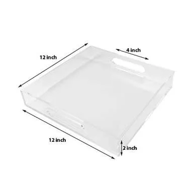 Show more Introducing the ultimate modern addition to your home, the Clear Sturdy Acrylic Serving Tray with Handles. This elegant, multipurpose tray is designed to cater to all your serving needs while enhancing your decor. Crafted from a sturdy, crystal-clear acrylic, this tray not only boasts an eye-catching appearance but also includes a smooth edge design for safer everyday use. The spill-proof feature ensures that your home remains neat and tidy, allowing you to confidently serve breakfast, appetizers, wine, coffee, and snacks without the fear of mess. With dimensions of 12W x 12L x 2H inches and a thickness of 4mm, it’s light yet incredibly strong, ensuring years of reliable use.
