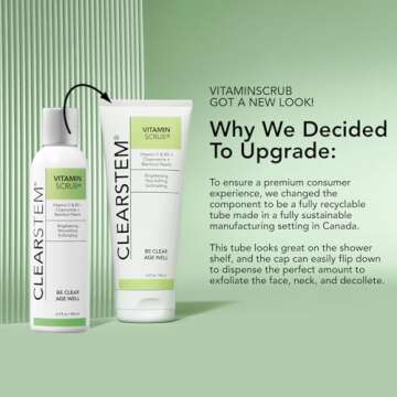 Show moreDiscover clear, vibrant, youthful skin with the CLEARSTEM VITAMINSCRUB, an antioxidant-infused scrub cleanser that redefines your skincare routine. This revolutionary formula expertly combines the power of Vitamin C, the soothing properties of Green Tea, and the gentle polishing effect of Bamboo particles. Designed to gently exfoliate, it effectively removes dead skin cells and unclogs pores, revealing a smoother and more refreshed appearance. Perfectly crafted for any skin type—whether you have dry, mature, sensitive, blemish-prone, combination, or normal skin—this scrub promises to invigorate your daily cleansing ritual.