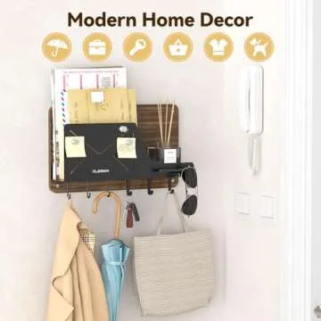 CLESOO Mail Holder Wall Mount - 6 Key Hooks Hanging Mail Organizer with Phone Holder - Letter Storage with Eyeglasses Holder, Magnets - Key Hanger with Shelf for Wall Entryway Hallway, Black