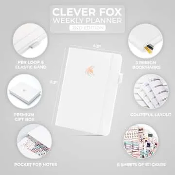 Show more The Clever Fox Planner 2nd Edition is your ultimate companion for getting organized and achieving your personal and professional goals. This innovative, colorful planner is designed with an undated layout, offering the flexibility you need to start planning at any point in the year. With its spacious A5 size (5.8x8.3 inches), you can comfortably jot down ideas, set long-term objectives, and create a clear vision for your life without the constraints of a typical calendar year. Its ability to last up to 12 months makes it a sustainable choice for individuals looking to maximize productivity.