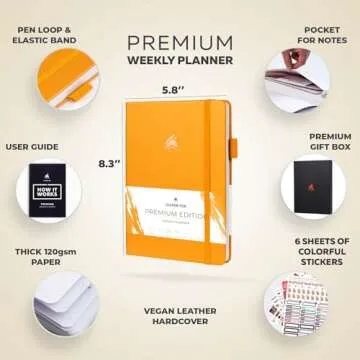 Introducing the Clever Fox Planner Premium Edition – the ultimate undated weekly and monthly planner designed for those who aspire to increase their productivity and achieve their personal and professional goals. Crafted with luxurious vegan leather and featuring a stunning amber yellow hardcover, this planner exemplifies elegance and function. With its thoughtful design, including a pen holder and a convenient pocket for loose notes, the Clever Fox Planner ensures you’re equipped with...