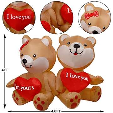 Show more Make this Valentine's Day truly unforgettable with our charming Valentine Inflatable decoration featuring Mr. Bear and Mrs. Bear. This delightful duo stands at an impressive 4 ft high and 4.6 ft wide, making it a show-stopping addition to your yard, garden, or even indoors. These adorable bears are not only cute but also expressive, each holding a heart that reads 'I love you' and 'I'm yours', setting the perfect romantic vibe for any occasion.
