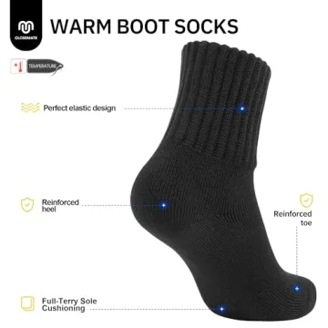 Show more Embrace warmth and comfort this winter with the **CLOSEMATE Women’s Thick Full Cushioned Thermal Warm Boot Socks**. Designed specifically for those frosty days, these socks are crafted from a luxe blend of 43% Acrylic, 42% Combed Cotton, 10% Polyester, and 5% Spandex. The result? A perfect combination that keeps your feet warm while providing an incredibly soft touch against your skin. Whether you're at home cuddled up on the couch or stepping out in stylish boots, these socks will keep your feet cozy and toasty!