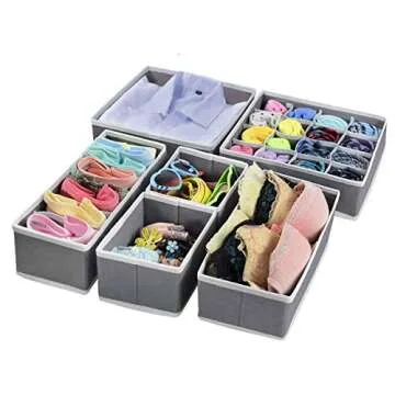 Show more Transform your cluttered drawers and cabinets into an oasis of organization with the Closet Drawer Dividers Organizers. Designed with both functionality and aesthetics in mind, this set of 6 foldable storage bins in a sophisticated grey hue will elevate your home organization game. These versatile dividers are perfect for sorting various items such as makeup, bras, socks, ties, and belts, ensuring everything has its designated space while keeping your drawers tidy and visually appealing. Made from durable materials, these organizers are not only functional but also easy to clean, making them an essential addition to every home.