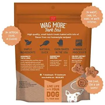 Show more Introducing Cloud Star Corp, Wag More Bark Less Soft & Chewy Grain Free Savory Duck Dog Treats, the ultimate in delicious and health-conscious snacking for your furry friend. Crafted with real duck and absolutely free of gluten, wheat, corn, soy, as well as artificial flavors and colors, these treats provide an indulgent taste while prioritizing your dog's well-being. Proudly baked in the USA, these minimally processed snacks contain only simple, wholesome ingredients, ensuring your pet receives a clean and nutritious option that promotes overall health and happiness.