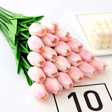 Show more Bring the beauty of nature into your home with our exquisite set of 20 artificial tulips. Each tulip stands at a height of 34cm (13.4 inches) and flaunts a stunning flower head measuring approximately 5cm (1.96 inches). Crafted with an eye for realism, these tulips feature vibrant colors, a lifelike texture, and real-touch flower heads that are bound to enchant any observer. Made from high-quality materials including environmentally safe latex and PU, these artificial blooms are designed to last and maintain their charm season after season.