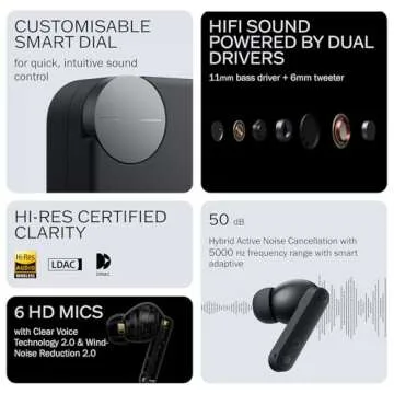 CMF Buds Pro 2 Wireless Earbuds, Hi-Res Audio with LDAC, 50 dB Hybrid Noise Cancelling Earbuds, Ultra Bass Technology, Bluetooth 5.3, 43H Play Time with Charging Case, 6 HD Mics Headphones, Dark Grey