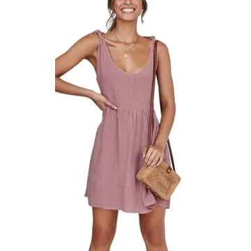 CNJFJ Womens Summer Shoulder Tie Strap Babydoll Dress Casual Scoop Neck A-Line Skater Swing Mini Sundress (Pink, Large)