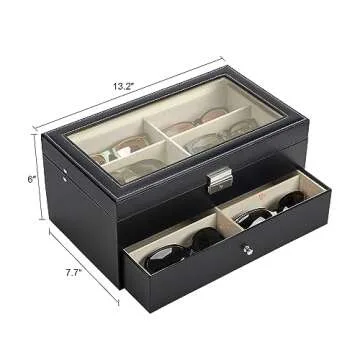 The standout feature of this sunglasses case is its transparent acrylic top, allowing you to effortlessly view all 12 compartments at a glance. No more hunting through drawers or boxes; you'll have instant access to every pair of sunglasses, ensuring you're always ready to match your shades to your outfit. Each compartment is designed to accommodate various sizes, and the removable divider gives you the flexibility to create custom space for watches or delicate jewelry. To top it off, the lockable lid adds security, protecting your cherished items from dust and moisture, ensuring longevity.