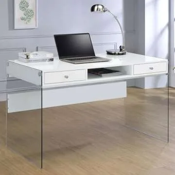 Show moreIntroducing the breathtaking Coaster Home Furnishings Dobrev 2-Drawer Writing Desk, a harmonious fusion of modern design and exceptional functionality tailored for the discerning professional or student. This stunning writing desk boasts a lustrous glossy white top complemented by robust clear tempered glass side panels, balancing strength and style. The desk’s artisan construction utilizes high-quality materials, including durable MDF, particle board, and laminate, ensuring a timeless aesthetic and long-lasting performance.