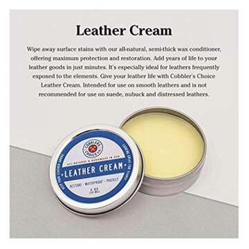 Show moreIntroducing the Cobbler's Choice Co. Finest Quality All Natural Leather Cream, the ultimate solution for revitalizing, conditioning, and protecting your cherished leather items. Formulated with an exceptional blend of triple filtered beeswax and natural seed oils, this cream deeply penetrates leather, ensuring it retains its elegant finish and resilience. Whether it’s your favorite pair of boots, handbags, or furniture, this 2-ounce (59 ML) premium leather cream rejuvenates the surface, bringing back its original beauty while providing unmatched protection against the elements.