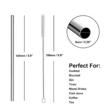 Show more Elevate your drink experience with the Cocktail Straws Short Stainless Steel Straw Set. This premium set of 8 mini cocktail straws is crafted from high-quality 304 stainless steel, designed to withstand the test of time and perform beautifully on every occasion. At 6 inches long and with a 6mm diameter, these durable straws are the perfect choice for sipping cocktails, coffee, juices, and more. The exquisite silver finish adds a touch of elegance to any beverage, making these straws not just functional but also chic.