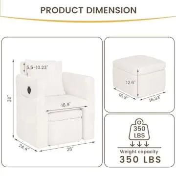 COCO DESIGN Barrel Accent Chair with Storage Ottoman, Sherpa Upholstered Modern Side Arm Sofa Chair for Bedroom/Office/Living Room, Adjustable Headrest, USB Charge, White