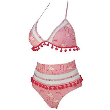 COCOSHIP Pink & Beige Flamingo Fringe High Rise Bikini Set Red Pom Pom Tassel Trim Top Halter Swimsuit Bathing Suit 14