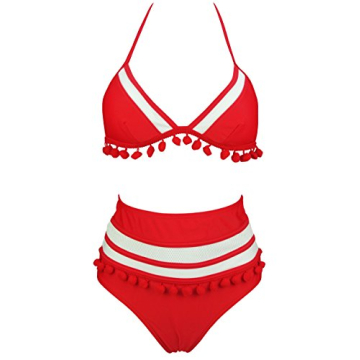 COCOSHIP Red & White Mesh Striped High Waist Bikini Set Tassel Trim Top Halter Straps Swimsuit Bathing Suit 4(FBA)