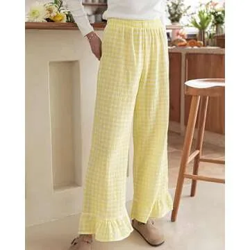 codcm Womens Gingham Pants Wide Leg Lounge Pants Y2k Plaid Print Ruffle Hem Loose Trouser(Yellow,Medium)