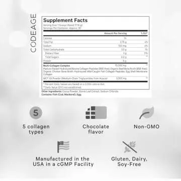 Show more Introducing the Codeage Multi Collagen Chocolate Protein Powder, your delicious daily boost towards enhanced health and well-being! This advanced formula combines the richness of five collagen types - 1, 2, 3, 5, and 10 - in a delightful chocolate blend that not only tastes great but also supports your skin, hair, nails, and joints. Designed with health-conscious individuals in mind, this hydrolyzed bovine collagen powder incorporates 18 amino acids to provide comprehensive benefits for any wellness routine.