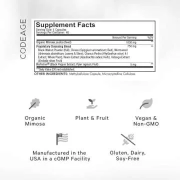 Show moreIntroducing the Codeage Organic Mimosa Pudica Seed Capsules, a premium dietary supplement crafted to enhance your overall wellness through the power of nature. Each convenient capsule delivers a potent dose of 1,000 mg of organic mimosa pudica seeds, renowned for their distinctive properties that promote digestive health and overall bodily functions. This supplement goes beyond mere seeds by incorporating a proprietary cleansing blend, featuring powerful ingredients such as black walnut, wormwood, cloves, chanca piedra, neem, vidanga, and BioPerine black pepper extract. You can trust that every bottle contains a synergistic mix designed to boost absorption and effectiveness, ensuring you get the most out of each serving.