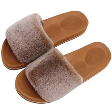 COFACE Womens Fuzzy Slippers Open Toe Fluff Slippers With Arch Support Plantar Fasciitis Orthotic Slippers Women Fur Slides House Shoes Khaki Size 9