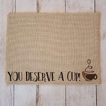 Coffee Maker Mat for your Coffee Machine, Burlap Coffee Bar Placemat, Coffee Station Accessories - Made in the USA (You Deserve a Cup)