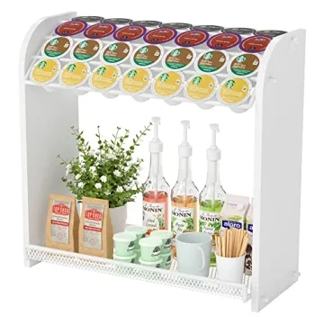 Show more Introducing the ultimate solution for coffee lovers: our large capacity Coffee Pod Organizer! This brilliantly designed K cup holder accommodates up to 28 K cups, arranged neatly in four rows atop, while also featuring a sleek bottom tray for storing essential coffee bar accessories such as stir sticks, syrups, and sugar packets. Gone are the days of cluttered counter spaces — with this organizer, everything is beautifully within reach to enhance your coffee experience. The seamless blend of high-quality bamboo and durable metal material not only ensures longevity but also adds a stylish touch to any kitchen or office decor.