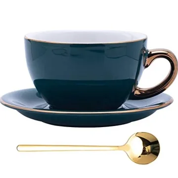 Coffeezone Luxury Gold 10 oz Thick Ceramic Latte Art Cappuccino Barista Cup with Saucer (Peacock Green)