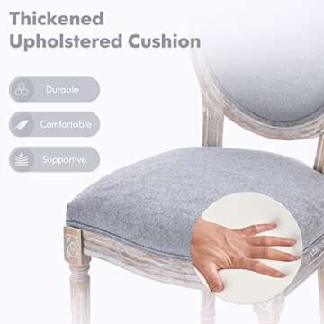 Show moreIntroducing the COLAMY French Country Vintage Dining Chairs Set of 4—an exquisite combination of elegance and comfort! These chairs are designed to bring the delightful charm of vintage French furniture into your home. With their timeless farmhouse-style wood frame and sophisticated upholstered design in classic grey, they not only enhance your home decor but provide a comfortable seating solution for those special moments around the dining table or any gathering space in your home. Each chair features a round back silhouette that adds an artistic touch, making these chairs a perfect blend of aesthetics and functionality.