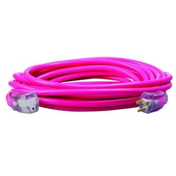 Show more Introducing the ultimate ALL PURPOSE EXTENSION CORD, designed specifically for both indoor and outdoor use, making it ideal for jobsites, workshops, warehouses, and beyond. This extraordinary extension cord features a highly visible fluorescent pink jacket, ensuring that safety is prioritized while also providing a unique touch that prevents loss and theft on busy jobsites. Not only is it bright and eye-catching, but it is also constructed with a wate-resistant vinyl jacket that protects against moisture, abrasion, and harmful UV rays from sunlight, ensuring its longevity and reliability.