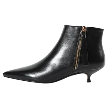 Show moreIntroducing our exquisite COLETER Women's Black Leather Kitten Heels Ankle Boots, designed for the modern individual who values both style and comfort. Crafted meticulously from high-quality smooth leather, these boots are not just footwear but a statement of sophistication that can elevate any outfit. With an elegant heel height of approximately 3.5cm (1.38 inches), they provide the perfect balance of style and ease, making them ideal for casual outings or professional settings. The pointed toe design exudes a chic aesthetic, while the zipper closure offers both practicality and modern flair, allowing you to slip them on and off effortlessly.