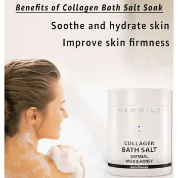 Show more Indulge in a luxurious bathing experience with New Miuz's exquisite Anti-Aging Collagen Bubble Bath Salt. This oatmeal honey bath soak is expertly crafted to nourish and hydrate your skin, promoting a youthful, firmer, and irresistibly silky-soft touch. Harnessing the skin-rejuvenating power of collagen, this bath soak delivers natural relief and recovery to rejuvenate your skin while providing a soothing escape from everyday stress.