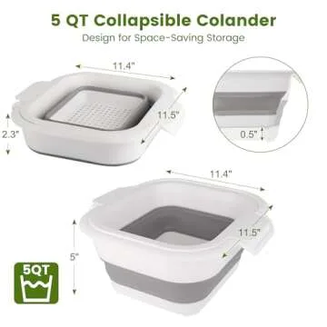 Collapsible Colander Set with Strainer Bowl, 2 in 1 Fruit Washing Basket with Strainer, 5 + 3 QT Plastic Colander for Kitchen, Foldable Double Layered Colander Bowl for Berry, Vegetable, Grey & White