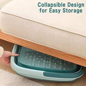 Show more Introducing the ultimate collapsible foot spa, designed to provide a soothing and rejuvenating experience for your feet anytime and anywhere. This foot tub’s foldable design allows it to be easily stored in compact spaces such as under beds, in drawers, or even in your car, making it perfect for travel and camping. With a folded size of just 3.1” x 16.9” x 12.6”, it offers convenience without sacrificing quality.