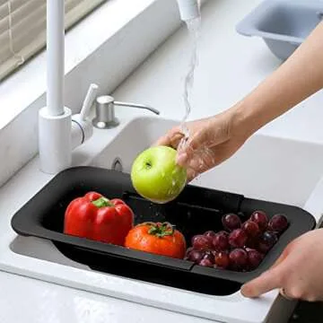 Collapsible Sink Colanders and Strainers Basket Extendable Plastic Fruit Vegetable Strainer Drainer Basket for Kitchen (Length 13.6 inch-18.7 inch) (Black)