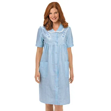 Show moreIntroducing the ultimate summer companion: a relaxed-fit, short-sleeved duster that effortlessly blends comfort with style. This exquisite piece features a charming gingham print that adds a touch of whimsy to any outfit. Designed with meticulous attention to detail, it showcases beautiful floral embroidery, creating an eye-catching look perfect for any casual outing or lounging at home. Equipped with two generous front pockets, it ensures practicality for everyday tasks, allowing you to keep essentials at hand. The snap-front closure makes it incredibly easy to put on and take off, ideal for anyone with limited mobility or for those who simply appreciate convenience. The lacy-trimmed collar adds an elegant finishing touch, giving it a unique personality. This duster is not only functional but also a lovely statement piece that brightens up summer days and keeps you cool. Made from a soft blend of cotton and polyester, this garment provides breathable comfort, making it suitable for all-day wear. The approximate length of 40 inches offers ample coverage while allowing for ease of movement. It’s machine washable, ensuring that maintaining its beauty is a breeze. Whether you are enjoying a sunny day outdoors or needing a cozy outfit indoors, this duster is the perfect addition to your wardrobe.