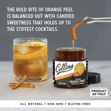 Show more Indulge your inner mixologist with the Collins Orange Twist in Syrup, a sumptuous jar of premium candied orange peels designed specifically to elevate your cocktail experience. Crafted by the renowned Collins Brothers, these orange twists are not just an ordinary garnish; they are the secret ingredient for turning your favorite drinks into extraordinary masterpieces.