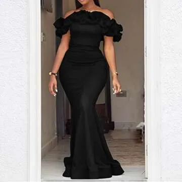 Show moreIntroducing the stunning Mermaid Maxi Dress, a show-stopping creation that balances both fashion and elegance. Made from a luxurious blend of 95% Polyester and 5% Spandex, this dress promises not only comfort but also a touch of opulence that enhances your every curve. The soft, skin-friendly fabric caresses your body, making it an absolute joy to wear. Featuring an alluring off-shoulder neckline, elegant ruffled selvedge, and a body-hugging figure-fitting silhouette, this dress is sure to make you the center of attention at any event.