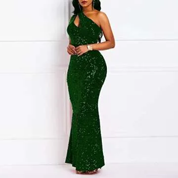 Cololura Women Sequin Elegant Sexy One Shoulder Tassel Oblique Collar Mermaid Bodycon Cocktail Evening Dress Green