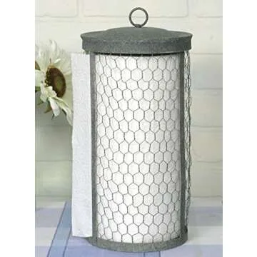 Show moreIntroducing the **Colonial Tin Works Chicken Wire Paper Towel Holder** in a stylish grey color, a perfect blend of rustic charm and functionality designed to elevate your kitchen decor. This paper towel holder features a sturdy central pole that securely supports your paper towel roll while a cleverly designed slit on the side allows easy dispensing. Made from high-quality materials, it is built to withstand daily use while adding a touch of farmhouse style to your space. With dimensions of 6½ inches in diameter and 13 inches in height, it fits comfortably on any kitchen countertop without taking up too much space.