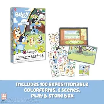 Show more Unleash the magic of creativity with the enchanting Colorforms - Bluey Play Set! This delightful set invites children into the whimsical world of the beloved show, Bluey, where imagination knows no bounds. The repositionable shapes stick and re-stick effortlessly, allowing little hands to create and recreate endless adventures. With this set, every playtime is an opportunity for storytelling and fun!